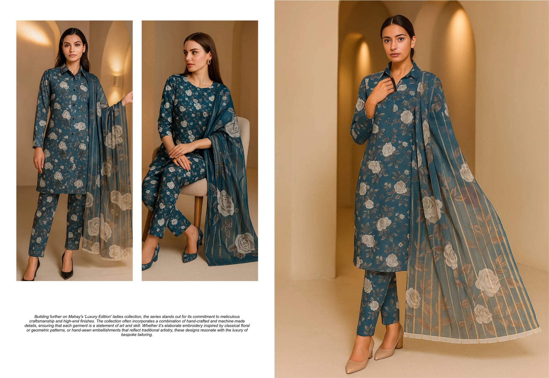 Elevate your wardrobe with our printed Blue Staple Linen Bana Dora Trouser Shirt with light weight Diamond Dupatta.