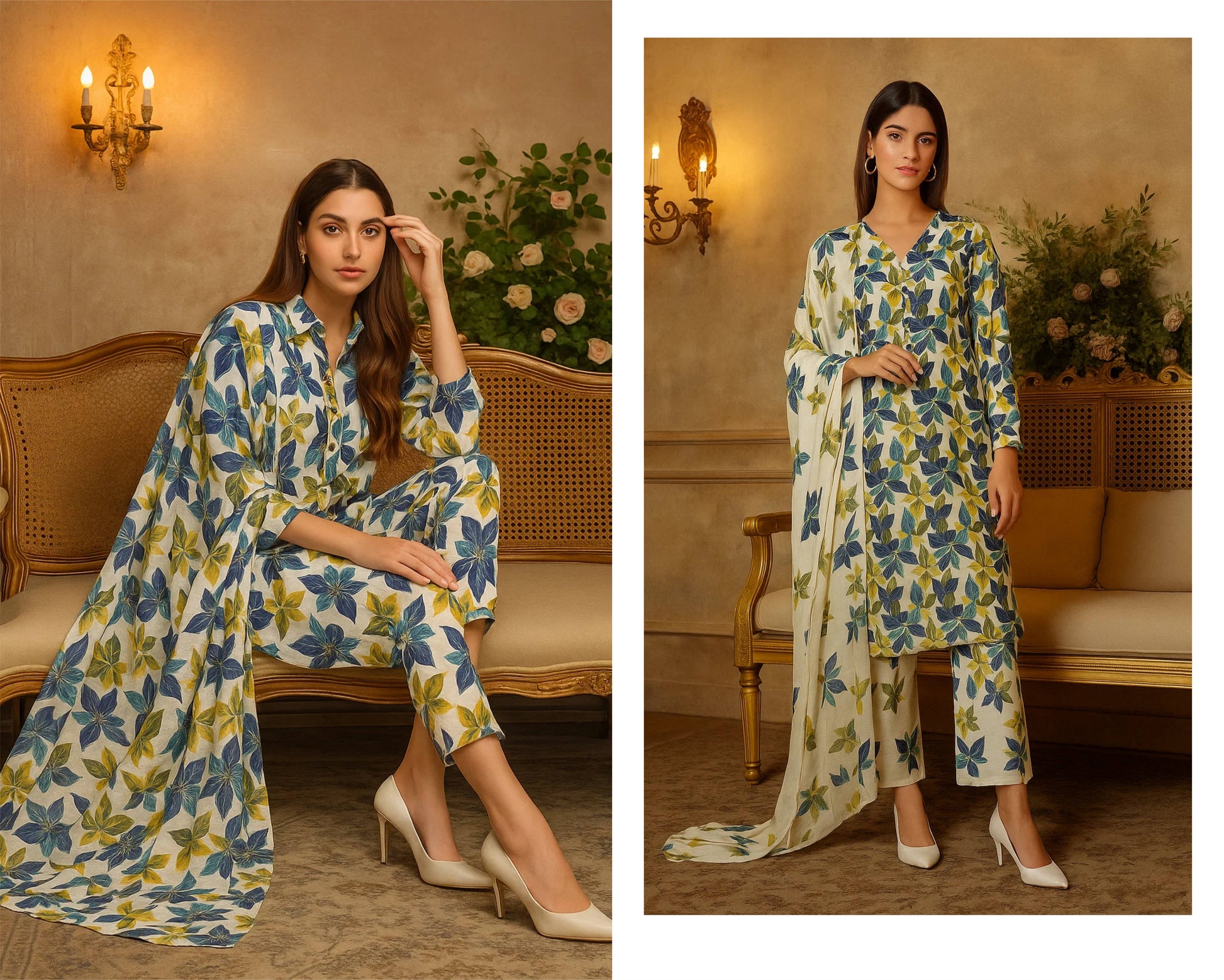 Elevate your wardrobe with our printed Skin Staple Linen trouser shirt with light weight Diamond dupatta.