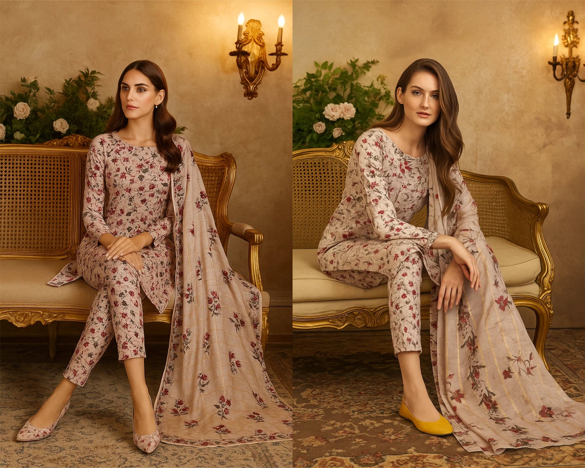 Elevate your wardrobe with our printed Dark skin Staple Linen trouser shirt with light weight Diamond dupatta.
