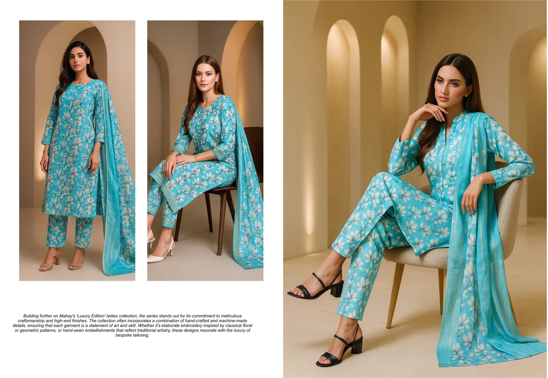 Elevate your wardrobe with our printed Ferozi Staple Linen Bana Dora trouser shirt with light weight diamond dupatta.